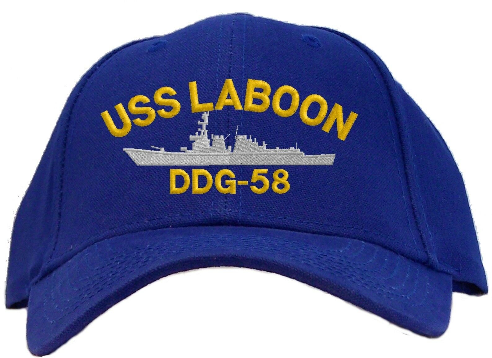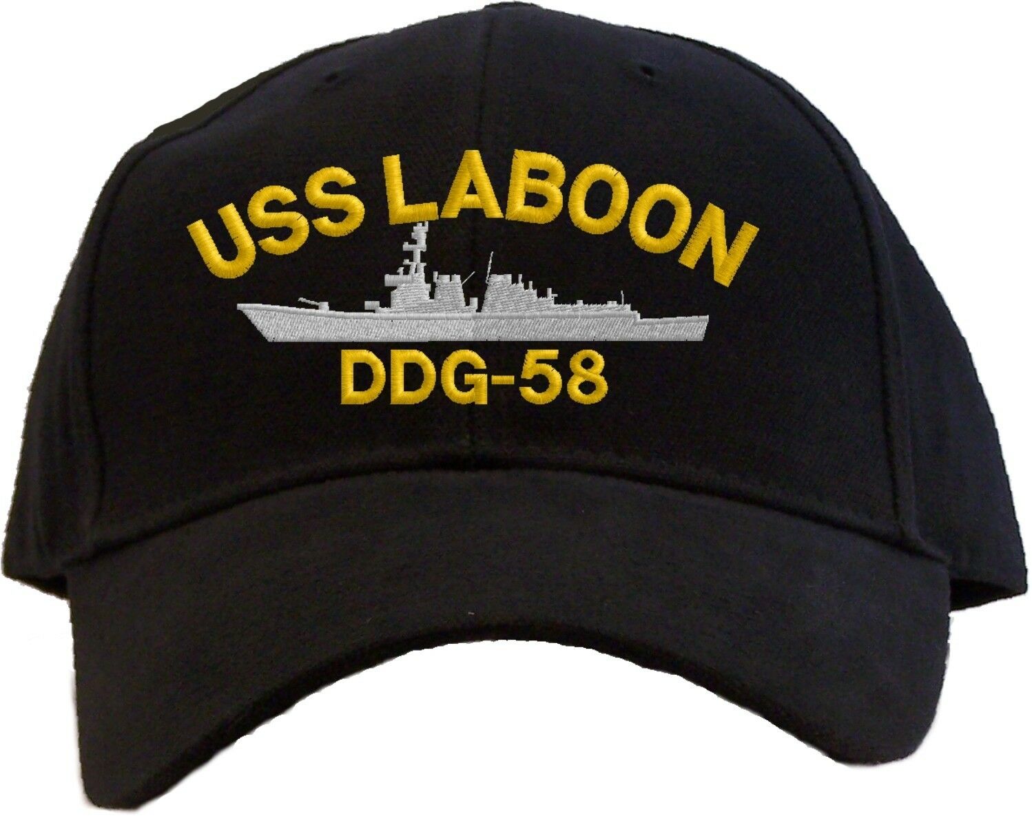 USS LABOON DDG-58 Arleigh Burke Class Guided Missile Detroyer Embroidered on (1) Baseball Cap in Your Choice of Cap Color AVAILABLE IN 6 COLORS NAVY, BLACK, RED, ROYAL, PURPLE, DIGITAL CAMO 6-Panel Baseball Cap Specifications: Fabric 100% Cotton Twill Structure Constructed Profile 3" Mid-Crown Panels 6 Panels, Seamed Front Closure Adjustable Hook & Loop Sizing One Size Fits Most Embroidered Design is Stitched Directly into Baseball Cap's Fabric and in the Thread Colors Shown.