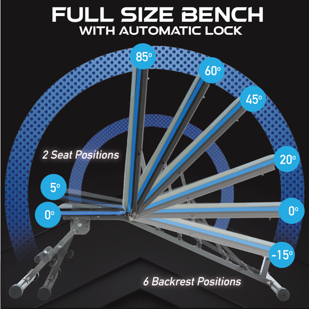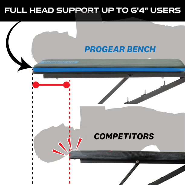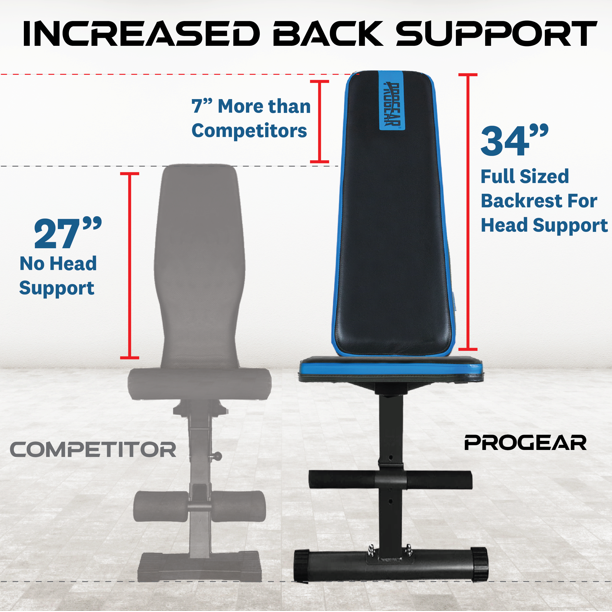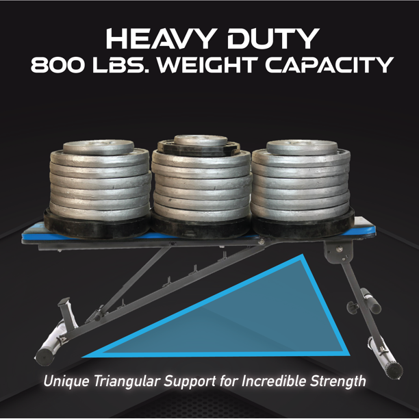 PROGEAR FITNESS. Stay Fit. Spend Less. Built with unique triangular support structure, the PROGEAR 1300 Adjustable and Foldable 12 Position Heavy-Duty Weight Bench with an Extended 800lb Weight Capacity and Leg Hold Down can support 800 lbs. of weight capacity and user height up to 6'4". It features 12 position adjustable backrest by utilizing 2 position front leg adjustment and a detachable 4 position adjustable leg hold down bar. The -20 degree decline to +80 degree incline angle adjustments are great for dumbbells, bench presses and other strength training exercises. While not in use, it can be folded for storage. So lets get started and hit your goals with PROGEAR 1300 Adjustable and Foldable 12 Position Heavy-Duty Weight Bench with an Extended 800lb Weight Capacity and Leg Hold Down.