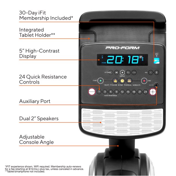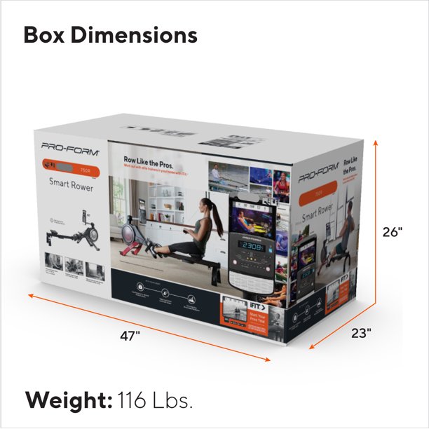 Get a gym-quality workout in the comfort of your home with the ProForm 750R Rowing Machine. Upgrade your equipment with an iFIT membership (sold separately) to elevate your exercise with interactive personal training in your home. Embark on a virtual journey around the world, rowing from the choppy waters of the English Channel to the pristine Portuguese sea. Automatic Trainer Control allows your iFIT Trainer to digitally adjust your resistance to create a totally immersive exercise experience. Transform your living room into a boutique Studio Class, enhancing your cardio endurance and building strength with virtual classmates. Your rower comes fully ready to provide an intense workout from the comfort of your home. Cycle through 24 digital resistance levels, adjusting the difficulty as you build strength or to accommodate specific exercises. A multicolor display keeps track of your important stats like distance traveled, time elapsed, and estimated calorie burn. Enjoy total support on an oversized cushioned seat. The seat is mounted on a solid steel rail and your rower is stabilized with adjustable leveling feet. When the workout is over, take advantage of your rower’s SpaceSaver design for compact storage.