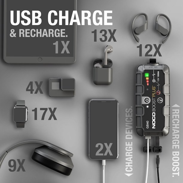 The NOCO Genius Boost Plus GB40 is an ultra-portable, lightweight and compact lithium car jump starter for 12-volt batteries. With 1,000-amps of starting power, it can safely jump start a dead battery in seconds - up to 20 times on a single charge.