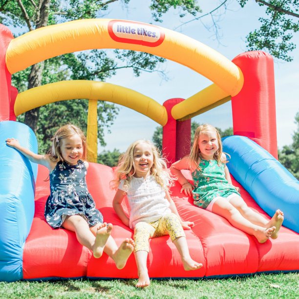 Kids will enjoy plenty of high-energy excitement while bouncing on this Little Tikes Jump 'n Slide Bouncer. This fantastic inflatable bounce house provides endless bouncing possibilities. It has tall, protective walls that surround a substantial play area to keep your kids safely contained inside. The wide slide on this kids inflatable bouncer comes with side rails that make for a fun exit. The Little Tikes bouncer comes with a blower, repair kit and a storage bag. It is simple to put up and take down each time your kids want to play. It is also optimal for parties. This helps promote kids playing outside and enjoying the outdoors. For parents, the Little Tikes Jump 'n Slide Bouncer is ideal because it is soft and safe.