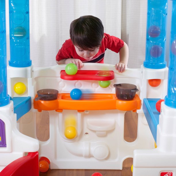 The Step2 Wonderball Fun House provides all-around ball play. On the outside, toss balls on the roof and watch as they fall through the maze of activities, making fun plinking sounds as they go. On the inside, place balls on the counter and watch as they zig zag. Flip the balls into the house, or into the maze with the included flipper. Helps toddlers develop fine motor skills with put and take play. The working Dutch door provides open and close play. The open design provides parents with a fun view of all the laughter and play taking place. When playtime is done, balls can easily be stored in the bottom basin.