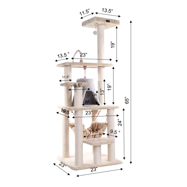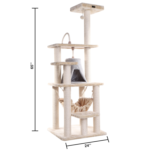 Armarkat model No. A6501 is Cat Daddy approved by noted cat behaviorist Jackson Galaxy and features a swinging hammock and condo.It Comes with 2 perch, 1 tent house, 1 swinging hammock, 1 sisal toy, 9 posts of natural sisal rope. F and B Bullet: Armarkat deluxe 65" cat Tower features six levels, each with a comfortable place for your cat to rest and relax. Beige with high density faux fur covering for felines comfort, coverings are permanently adhered to wood structures. Well constructed of 15mm pressed wood material, making it not only thicker but stronger. 100% natural, seasoned sisal rope wraps all posts securely for years of scratch. Dimensions: Post Diameter: 3.5"; Base: 24" x 24" Playhouse:14"(W) x 12"(H) Perch:14" x 12" Max holding weight: 50 lbs. Six-month warranty included. Replacement parts available from manufacturer.