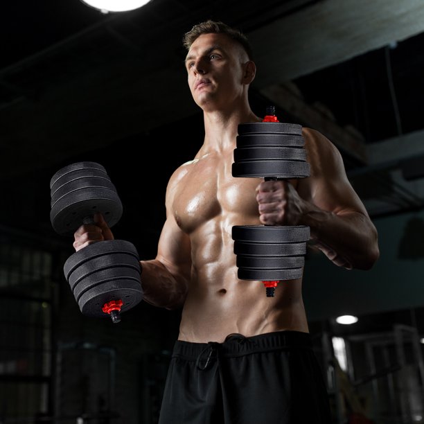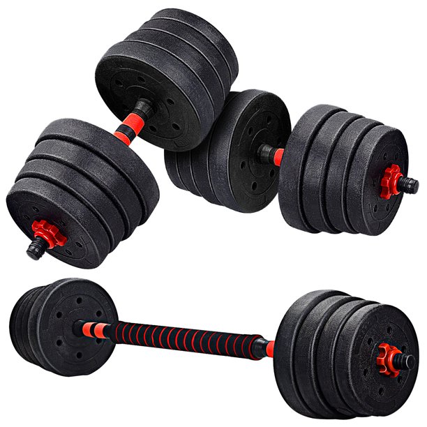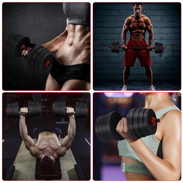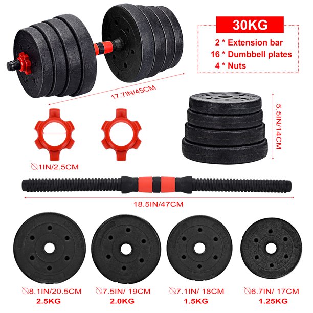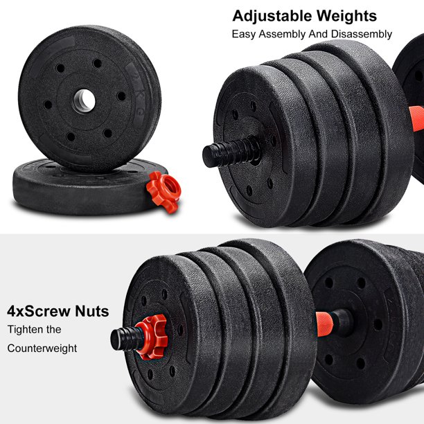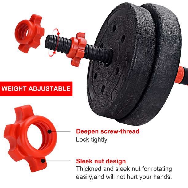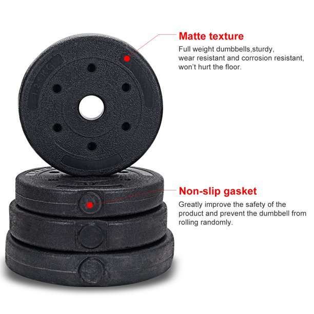 Good Material: Iron sand mixture for plates, PE material covered the surface. Hollow steel for main rod. Various weights and secure screw collars: Our dumbbells let you adjust the weight and try different combinations. Ideal for a total body workout, this dumbbell weight set is perfect for both upper and lower body building exercises. Octagonal-shaped, Anti Rolling Design: The anti-rolling design prevents your floor from scratching. Non-slip grips create a comfortable handle that helps prevent your palms from blistering. Easy use and storage: Compact size, easy to adjust weight by assembling or remove plates. 2 Set Dumbbells: 66 pounds for two dumbbells (33 pounds each), comes in one package, with four 4.4 pound plates, eight 5.5 pound plates. Four pieces of screw collars. Two black main rods (17.3" long) and one red connecting rod (4.3" long).