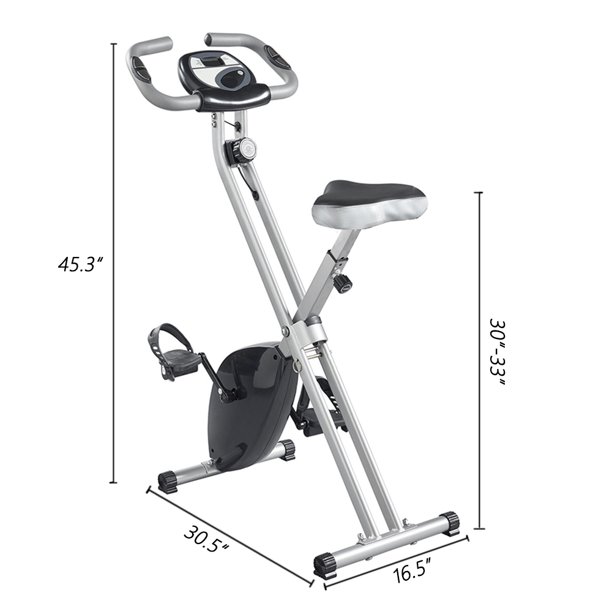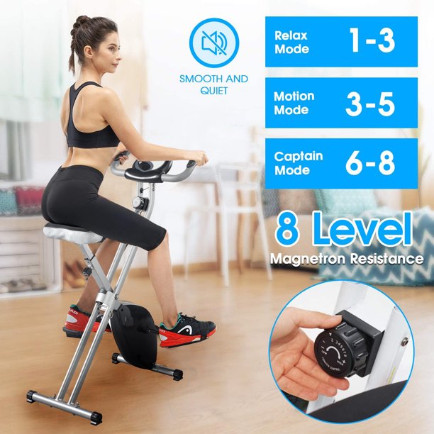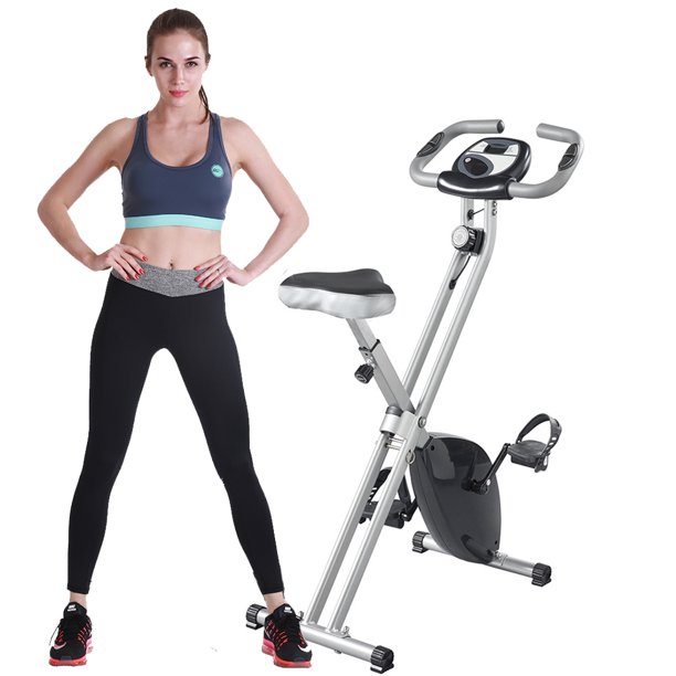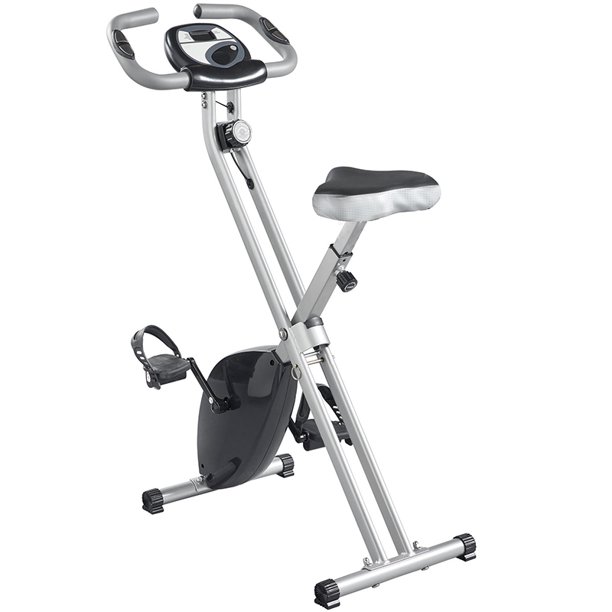 The Magnetic Upright Exercise Bike with Heart Pulse Sensors will help you work toward your fitness goals. The magnetic space saving exercise bike folds up for easy storage and rolls away when you're not using it.