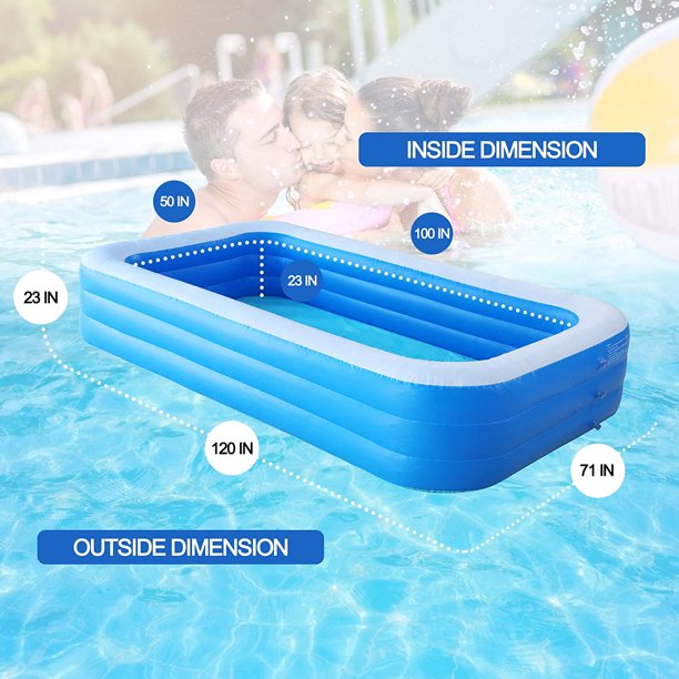 Family Sized Inflatable Pool for Summer Fun - Thanks to the large size: 120" X 71" X 23", this family inflatable swimming pool can hold up to 2 adults plus 3-5 kids to enjoy a splashing pool party in the backyard, join us and enjoy family fun on a hot holiday!