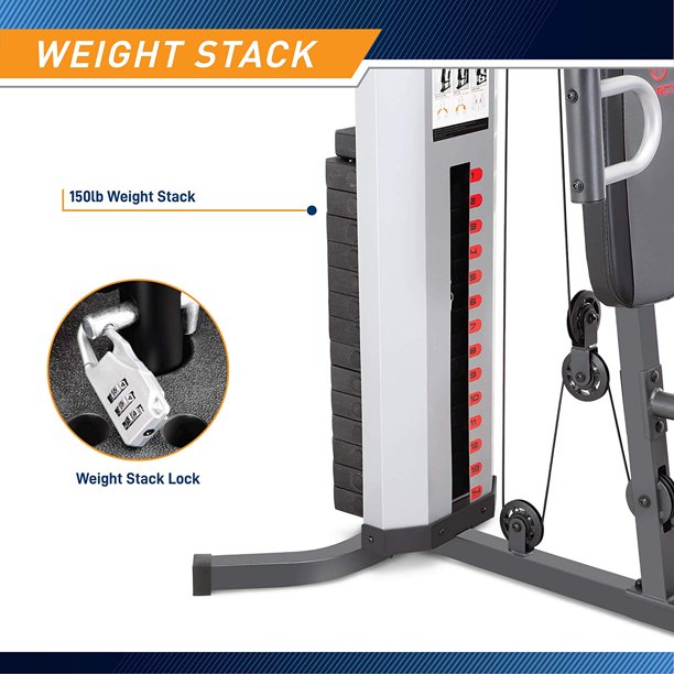Now you can have gym-Quality exercises right in your own home with this Marcy 150-Lb stack home gym. It works the lower body and strengthens your core to offer a total body workout. The multi-Function press arm and no cable changing means that you don't waste precious time reconfiguring the machine. This Marcy home gym features a vinyl-Coated weight stack as well as high and low pulley stations. Dual-Function press arm performs chest pressing and peck fly exercises and the adjustable preacher curl bicep pad allows for isolated bicep exercises. It has a weight capacity of 300 lbs. The frame is made of steel to ensure it holds up to regular use.